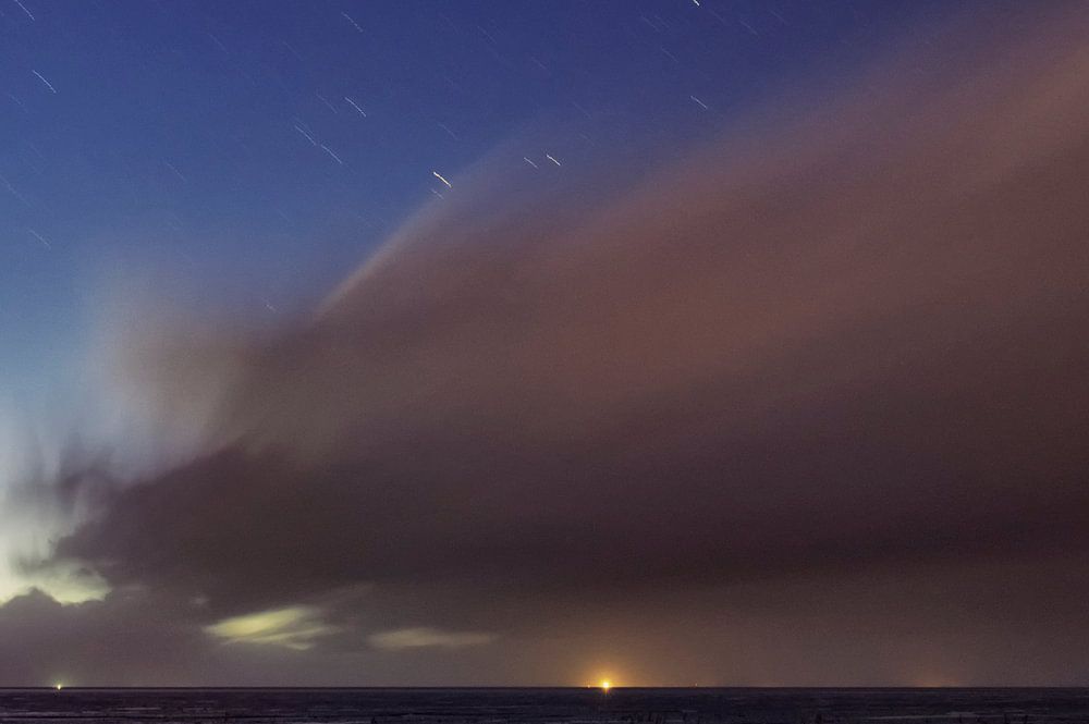 Storm of stormachtig was het weerbericht en ik stond met mijn rug bij de palenrij tussen Koehoal (Koehool) en Westhoek. Het statief stond gelukkig steviger als ik. Bijna waaide ik om het slik in. Er zit nog een restje licht achterin de horizon en de stormsnelheid in de wolken is goed te zien door de lange sluitertijd.