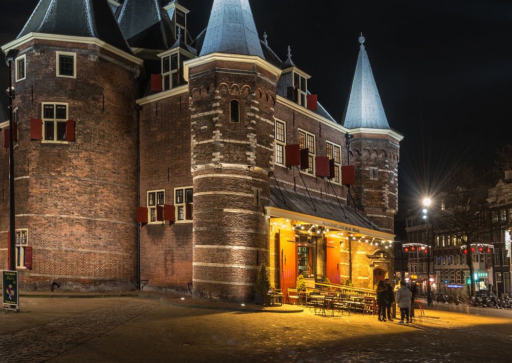 Waag gebouw op de Nieuwmarkt te Amsterdam. genomen bij nacht. Nachtfotografie met lange sluitertijd.