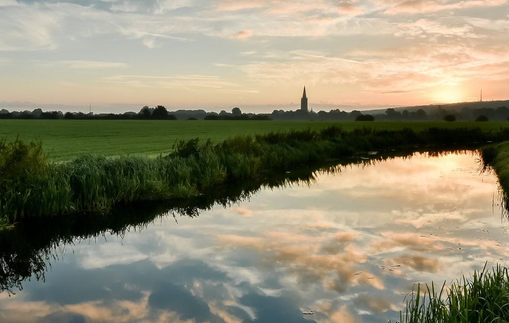 Op de grens bij Elten loopt een klein riviertje over de grens. In de vroege morgen spiegelt de opkomende zon en de kleurige wolkenlucht in het water.