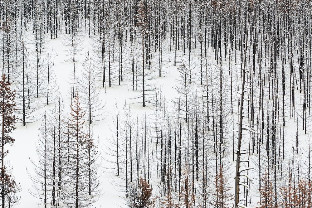 Dead forest, trees, woods in winter, nearly monochrome structures, Grand Teton National Park, Wyoming, USA.