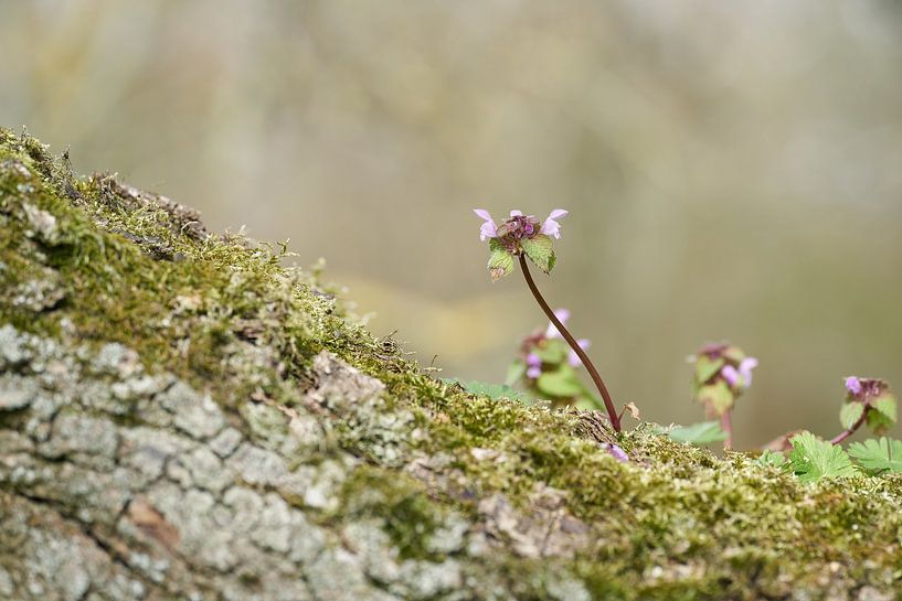 Deadnettle Lamium purpureum on a tree trunk in the forest in spring. In addition to my work as a photographer, I am also a tree inspector in nature. I love the rather inconspicuous details that I encounter in nature, especially in spring.