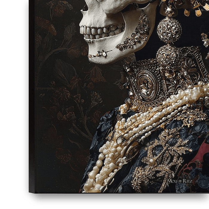 The skull appears like a royal relic, richly adorned with lush flowers, pearls and golden ornaments. Between the bones and jewellery unfolds a floral wreath of deep reds, soft pinks and dark, velvety leaves, lending death an almost solemn grace.
