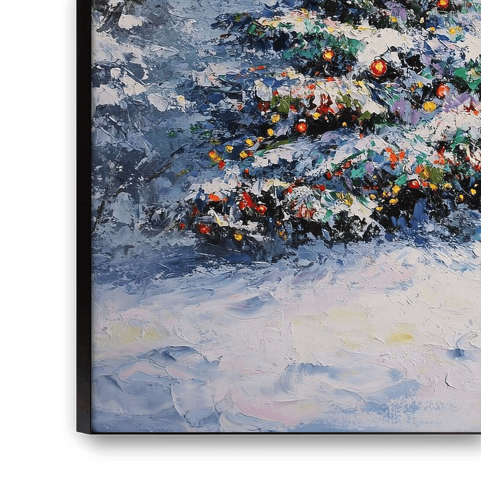 Details: Christmas painting, decorated Christmas tree, winter landscape, traditional Christmas, atmospheric Christmas, Christmas lights, gold star, snowflakes, holidays, cosiness