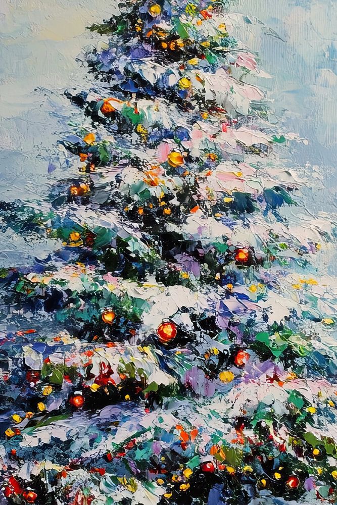 Decorated Christmas Tree - This Christmas painting shows a richly decorated Christmas tree with coloured lights and a gold star, surrounded by a snowy background and soft colour tones of blue and white.