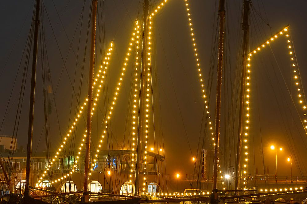 Decorated traditional sailboats in Harlingen Netherlands at Christmas time by night