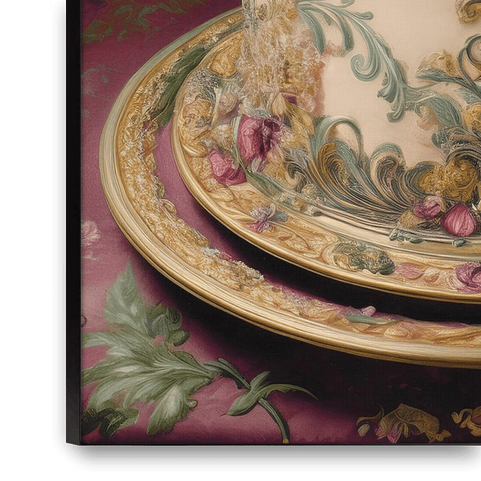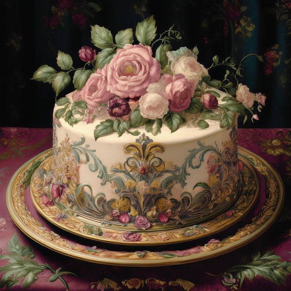 Painting of a beautiful, festive dessert in soft pink and with roses