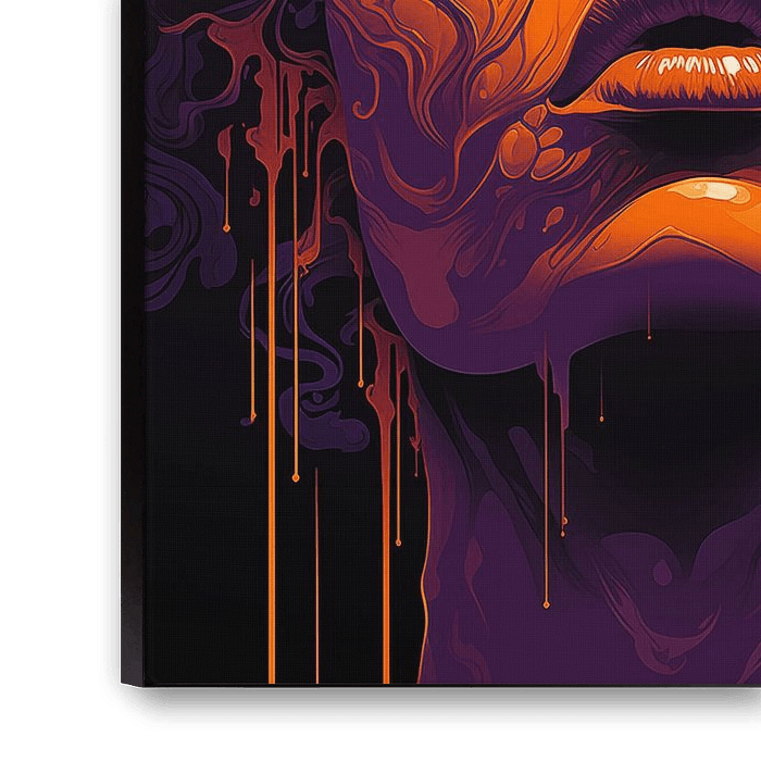 The painting shows a woman with a purple background. Her face is painted in a vivid orange hue and she has a dramatic, artistic look. Her eyes are closed and she seems to be in deep thought. The woman's face is the main focus of the painting and her unique appearance captivates the eye. The image was generated with AI.