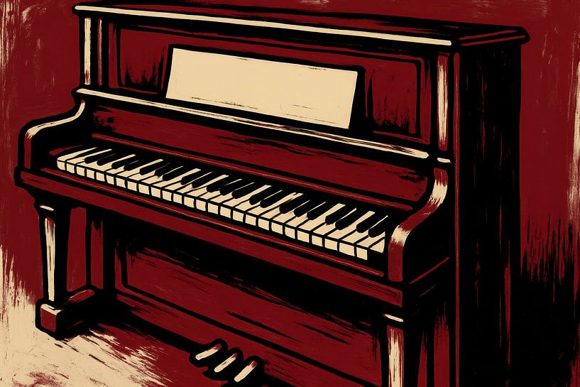 A grand piano with warm wood grain is powerfully depicted against a deep red background, with cream-coloured keys contrasting sharply with dark accents. The graphic lines and rough texture are reminiscent of a linocut, with strong contours and subtle shadows. The limited colour scheme creates tranquillity, while the strong contrast…