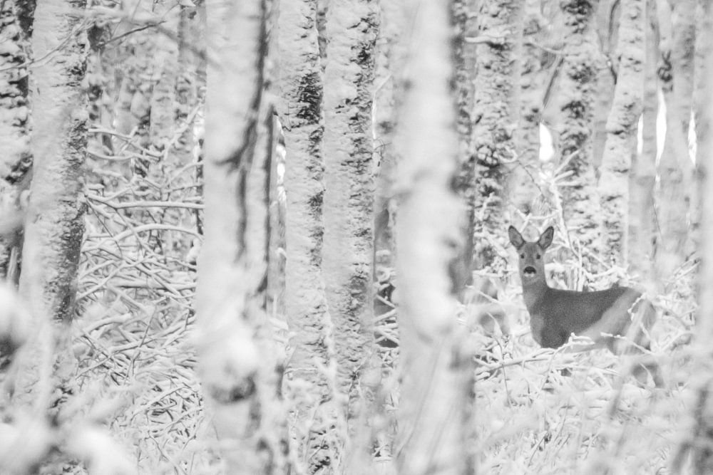 Deer in a winter forest (blackandwhite) by Martzen Fotografie
