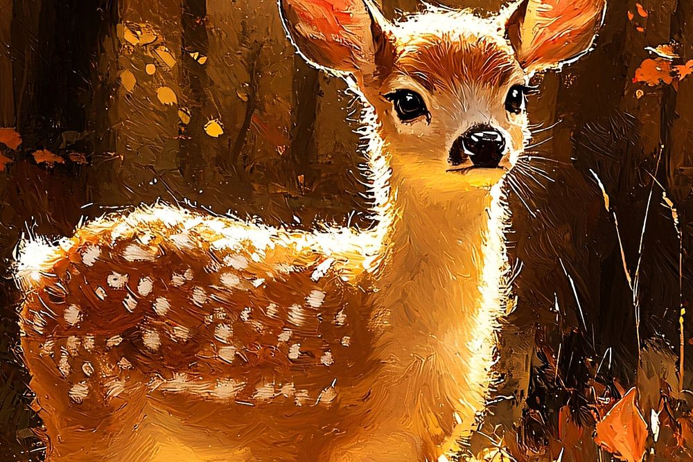 A beautiful design depicting the natural beauty of a deer calf in a warm autumn forest. The soft colours and the play of light and shadow create a serene and soothing atmosphere. Perfect as wall decoration for a living room, bedroom or hallway, this image brings warmth and nature to any space. The subtle contrast between the soft, downy appearance of the deer and the warm autumn colours makes this design ideal for animal and nature lovers. A real eye-catcher that exudes harmony and elegance.