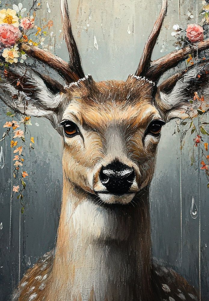 An enchanting painting of a deer with a garland of flowers in its antlers, against a dark, magical background. This work brings together the harmony of nature and art, ideal for atmospheric décor with natural accents.