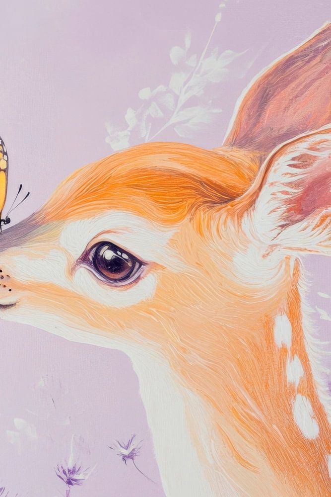 A delicate fawn with shiny, spotted fur is visited by a gentle butterfly on its snout. The dreamlike lilac-coloured backdrop and the delicate plants create a fairytale atmosphere where nature and grace merge harmoniously. Her eyes sparkle with curiosity and innocence in this idyllic setting.