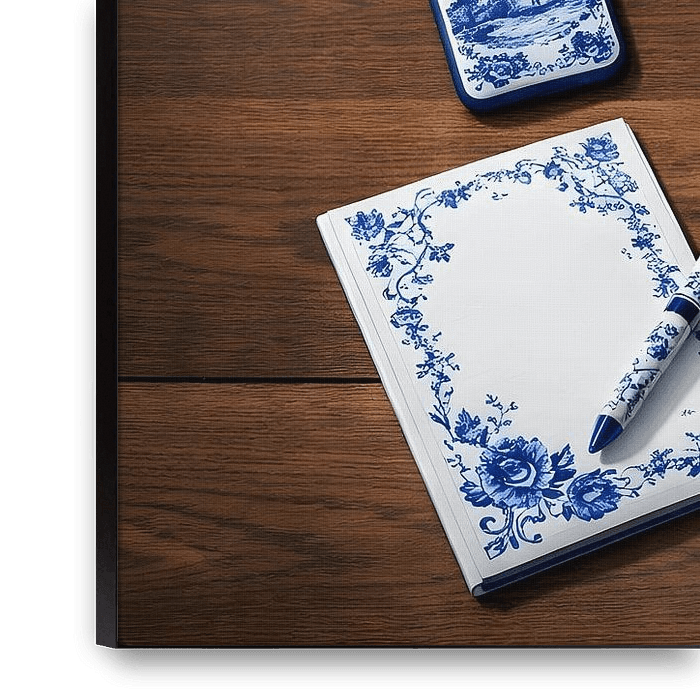 This Delft Blue artwork shows a modern workplace where technology and traditional Delft Blue come together. A laptop and smartphone with Delft Blue windmill print, combined with blue and white stationery, pen and Delftware-style coffee cup, form a sleek still life on wood. The image is perfect for lovers of delft blue, Dutch design,…