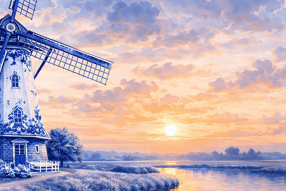 Golden Dusk is a Delftware-inspired landscape in which a classic Dutch windmill lights up in the soft evening light. The cobalt blue Delftware ornaments on the windmill contrast with the warm sunset, mirroring in the calm water. Clouds, reed beds and a flowery shore give the work a romantic, timeless atmosphere that perfectly suits…