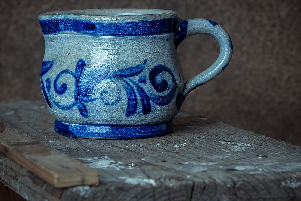 Delft blue jug on wooden painter's ladder.