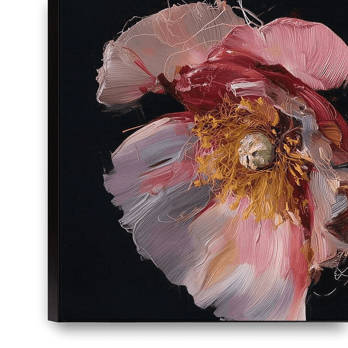 This elegant work of art depicts delicately painted flowers in soft shades of white and pink against a deep dark background. The loose, impressionistic brushwork lends the flowers a sense of lightness and movement, while the warm colour accents inside the blossoms create a vibrant contrast. The minimalist composition emphasises the…