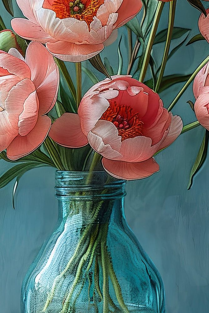 A romantic still life of pink peonies in a blue glass vase, perfect for an elegant room decoration.