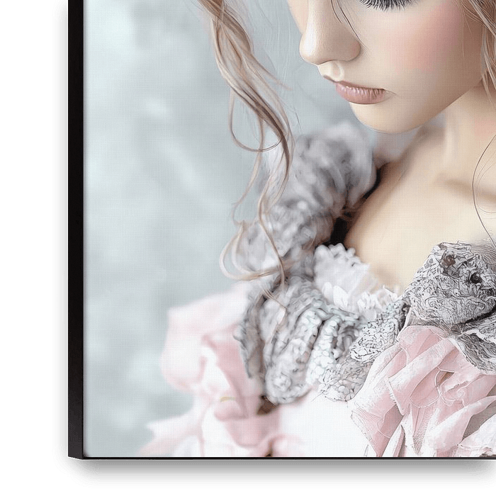 In this artistic portrait, time seems to stand still while delicate pastel colours draw the eye to a young woman in a graceful dress. Her head, tilted downwards and framed by soft, flowing curls, radiates a quiet elegance. The voluminous, pale pink headdress, adorned with elaborate bows and delicate lace, lends her an almost Victorian…
