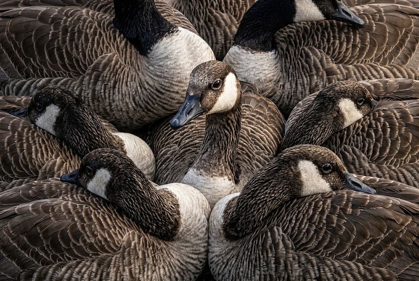 A textured cluster of resting grey geese forms a powerful natural portrait.
