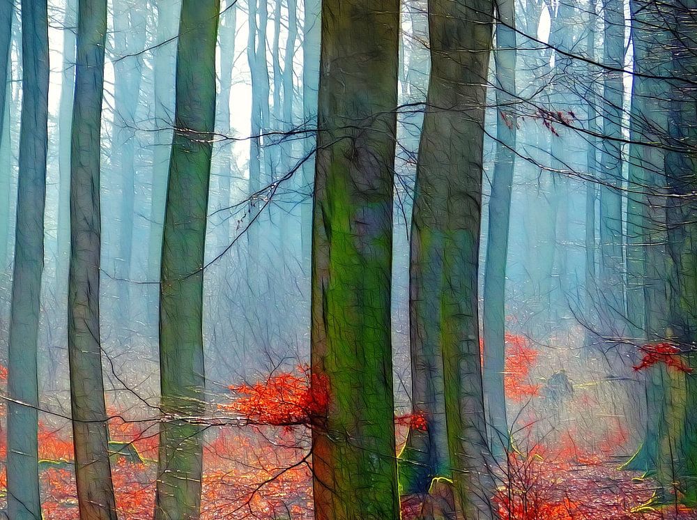 Tree trunks in a misty forest of Sauerland. A mysterious atmosphere... The fine colours of mist and leaves on the ground create beautiful shades in this image!