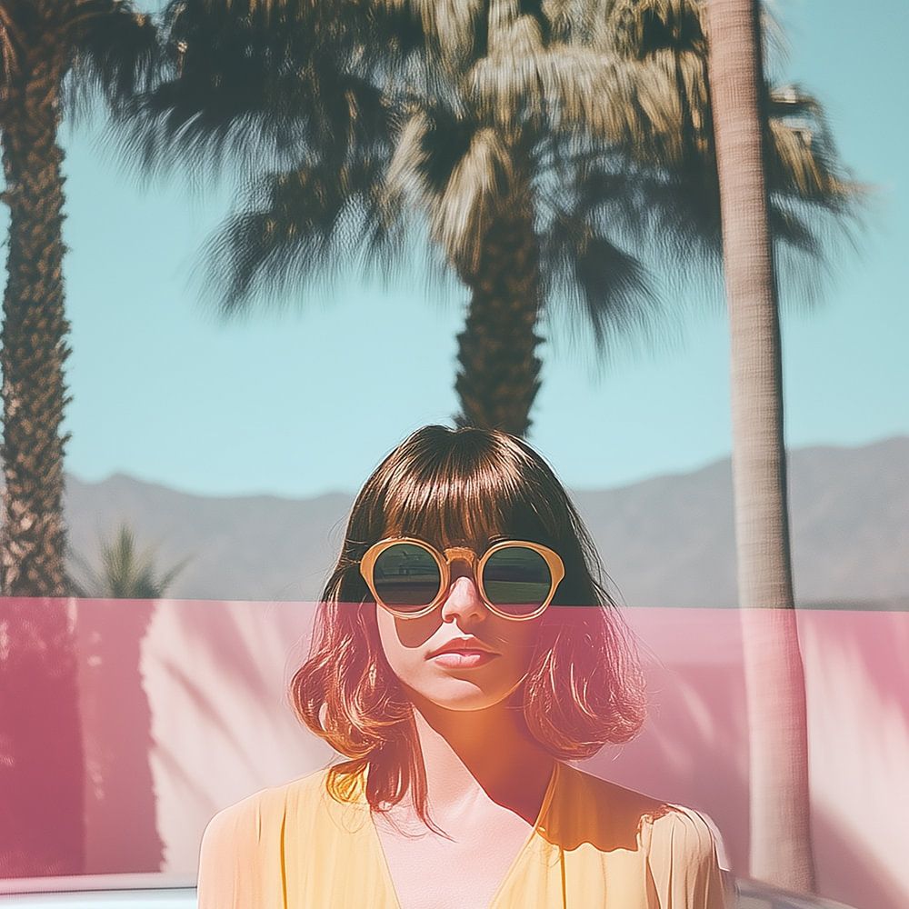 Step into a dreamy world of sunshine, palm trees and vintage flair with Desert Dreaming. This artwork captures the essence of a relaxing road trip through a summer landscape. A stylish woman wearing retro sunglasses exudes elegance, surrounded by a classic car, tall palm trees and a warm desert background. The pink glow and soft shadows give the image a dreamy and cinematic feel.