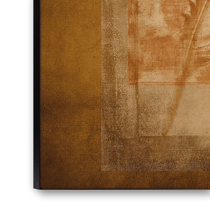 In this monochrome work in sandy beige and brown, a feather is centered within square and rectangular distressed textures. The work is warm in color and the rustic, tribal style would fit well with a boho-style interior.