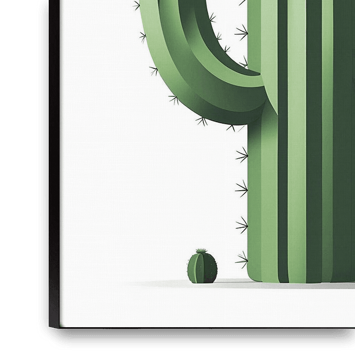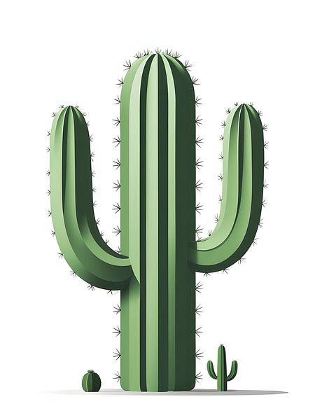 A clean, minimalist illustration of a classic saguaro cactus with its distinctive upward-reaching arms. Rendered in shades of green with subtle shading and delicate spines, this desert icon stands tall with small desert plants at its base. Perfect for southwestern decor, desert-themed designs, or adding a touch of arid landscape beauty…