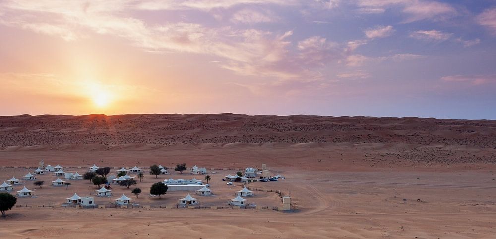 Tents in a desert camp in Oman at sunset as a panoramic photo