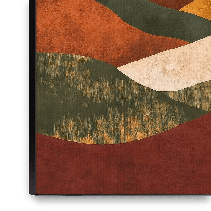 A harmonious landscape dominated by rolling hills and a radiant, golden circle of sunlight is presented in soft earthy tones. The warm colours tell of the tranquillity of nature, while the clear lines and simple shapes radiate a timeless elegance. A feeling of peace and space fills the scenery.