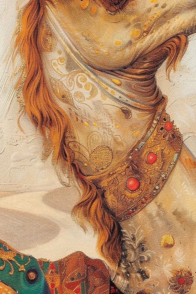 In "Desert Rock", a camel, royally decorated with a tapestry of rich ornaments and colourful patterns, exudes dignity and grace. Its facial features capture the softness and tranquillity of the animal, while its posture evokes the ancient spirit of the desert. The camel bears signs of a traveller's life and will bring this adventurous spirit to any space.