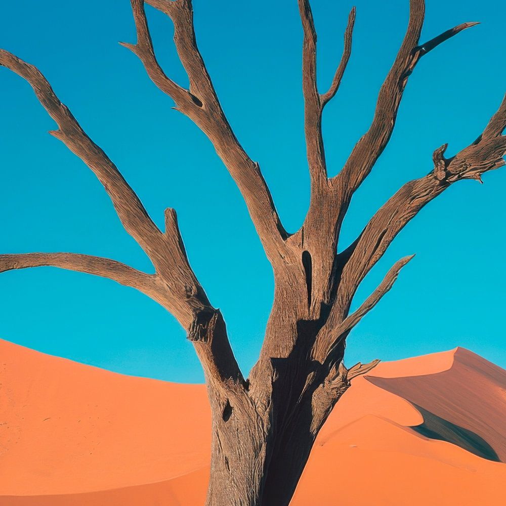 A lone, mournful tree rises majestically against a bright blue sky. The bright orange-coloured dunes in the background create a dramatic contrast, while the radiant moon in the upper corner creates an almost mystical atmosphere. The forces of nature and the passage of time appear here in perfect symbiosis.