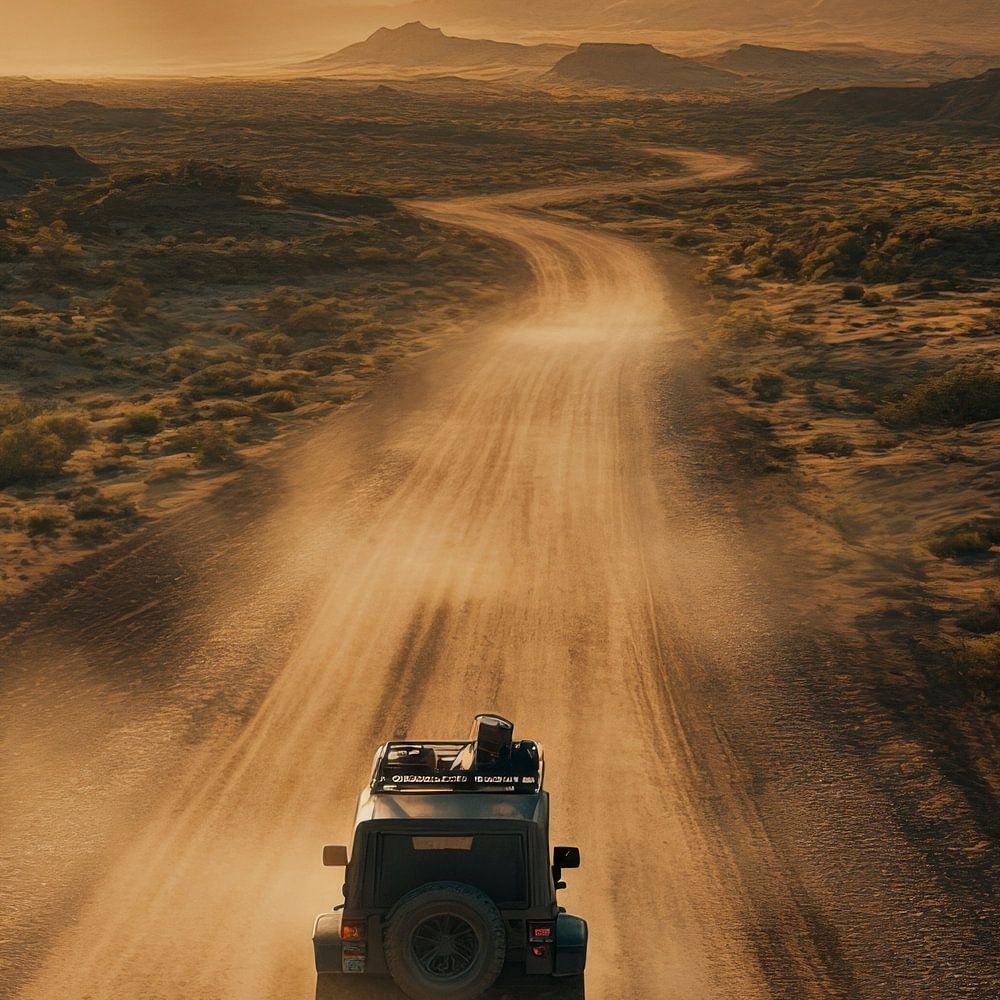 A remote path winds its way through a majestic desert landscape, where the golden rays of the evening sun bathe the rocks and rolling hills in a warm light. A vintage jeep trails a cloud of dust behind it as it drives towards the horizon, where sky and earth merge in soft pastel colours. Adventure is in the air.