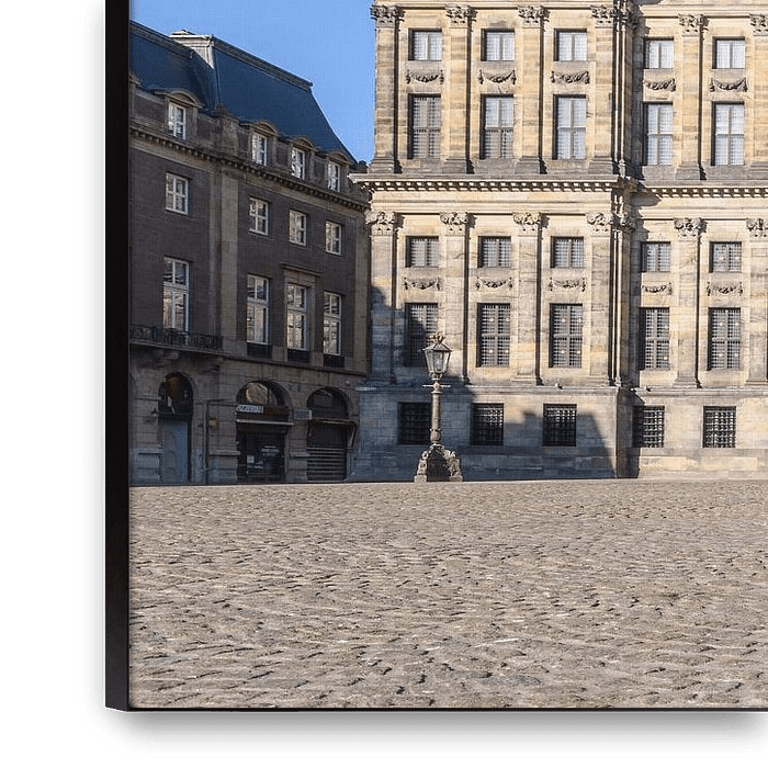 Deserted Dam square with the Royal Palace of Amsterdam in Amsterdam during a weekday morning. There are no people on the square because of the COVID-19 pandemic corona virus lockdown.