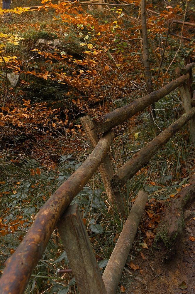 The wooden handrail acts as a strong guiding line, drawing the eye into the image, towards the depths of the forest. The path, with its natural texture of mud and…