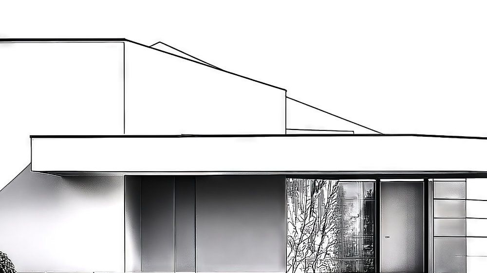 This minimalist black and white architectural sketch shows a modern detached house with a well-tended gravelled garden. A bright yellow sun shines over the house, creating a warm and lively contrast to the clear lines of the building. The illustration combines contemporary design with a touch of nature.