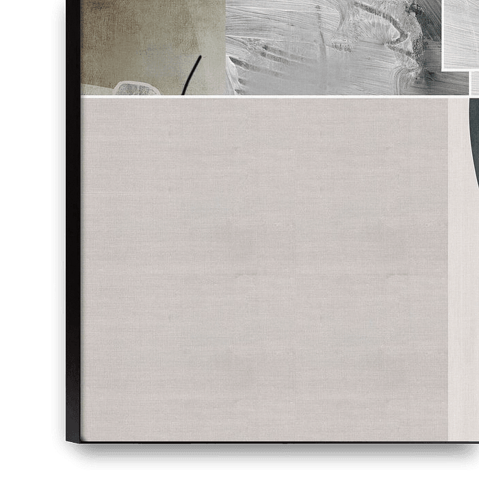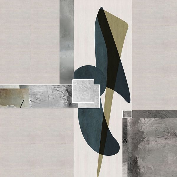 Minimalist, abstract, geometric artwork with a central focus on a group of organic shapes in dark blue-green, olive green and black against a light, creamy white background. The overall colour palette is restrained and focuses on neutral tones. The style is modern and emphasises geometric abstraction and textural contrasts.