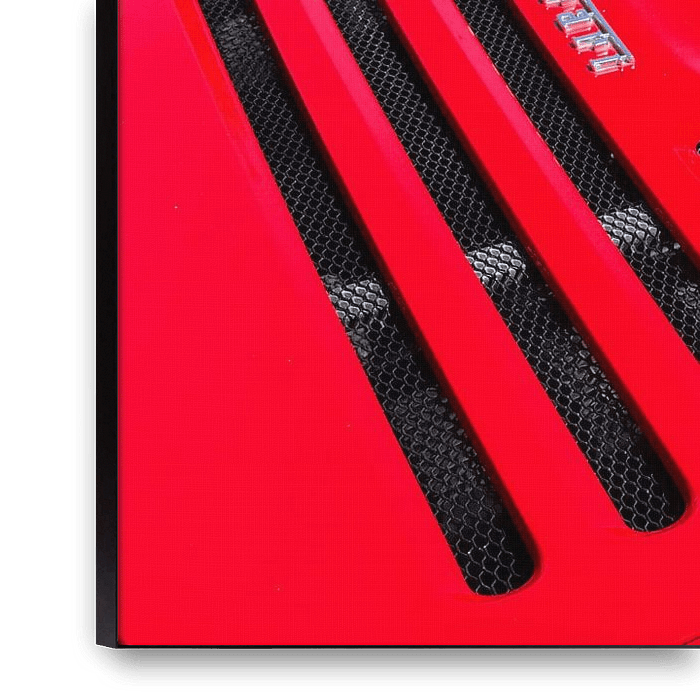 Detail on a red Ferrari F355 sports car. The Ferrari F355 (Type F129) was manufactured from 1994 to 1999 and is fitted with a V8 engine.