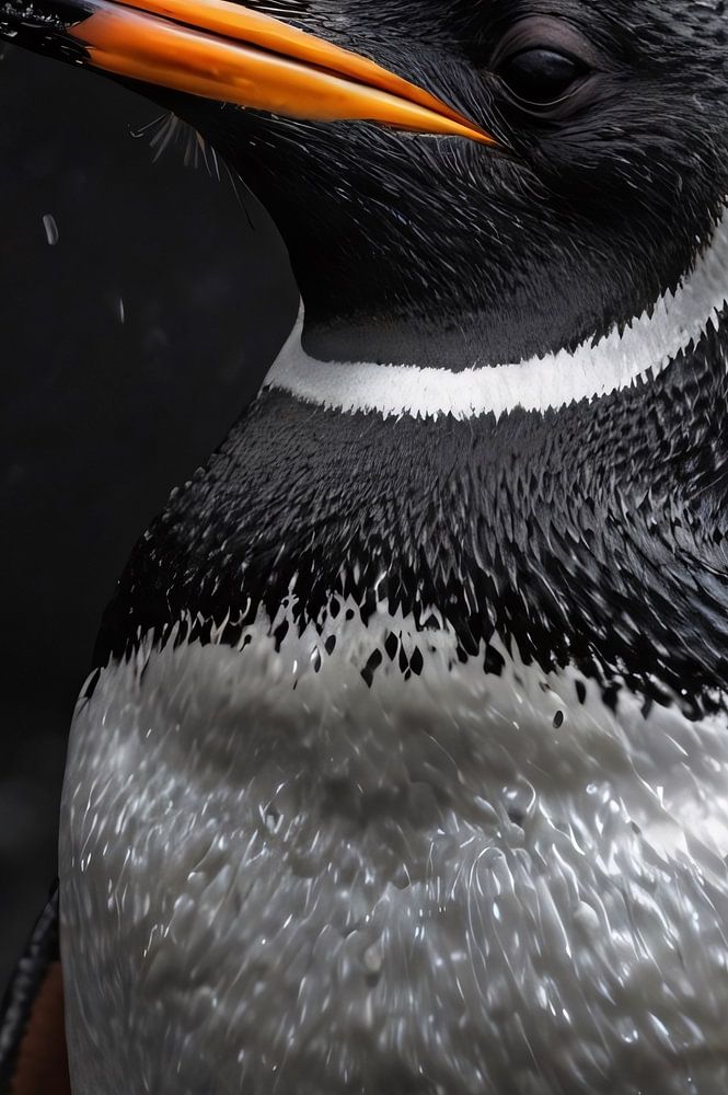 This beautiful artwork shows a penguin in stunning detail, with every feather and water drop rendered with hyper-realistic precision. The dark background makes the bright colours of the beak and eye stand out. This design fits perfectly in a modern or minimalist space, such as an office or bedroom, where it makes a calm yet impressive statement. Using a monochrome style with subtle contrasts, the image exudes both serenity and elegance. It is a perfect choice for animal and nature lovers looking for an artwork that is both visually stunning and captivating.