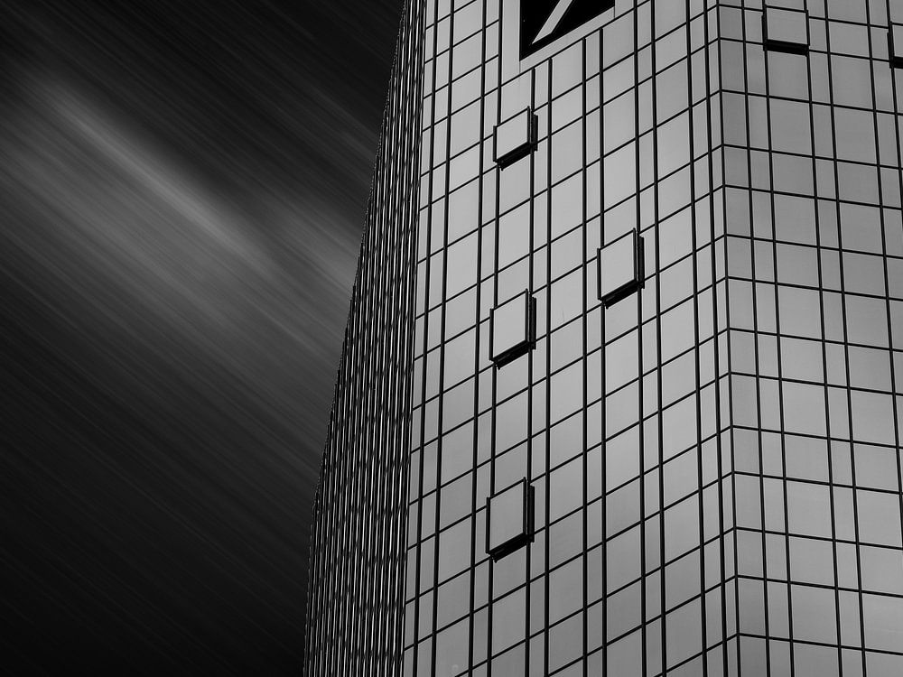 Black-and-white shot of the modern Deutsche Bank building in Frankfurt am Main.