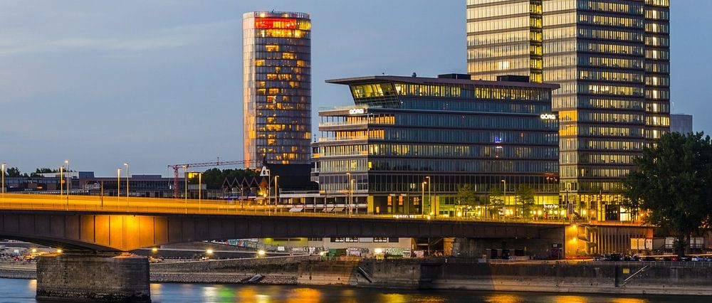 Deutz Bridge, LVR Tower also Triangle high-rise, Görg business law firm and Lanxess Tower, Deutz, Cologne, North Rhine-Westphalia, Germany, Europe