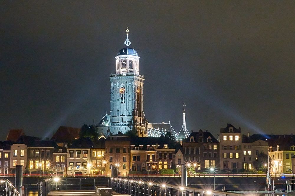 Evening skyline of Deventer, view from the jetty at the IJssel on the gothic hall church in Deventer 'The Lebuïnuskerk' at the 'Grote Kerkhof'.