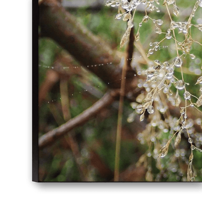 Elegant dew pearls formed on a plant. The reflection of the light makes the water droplets look like pearls. A sparkling piece of nature.
