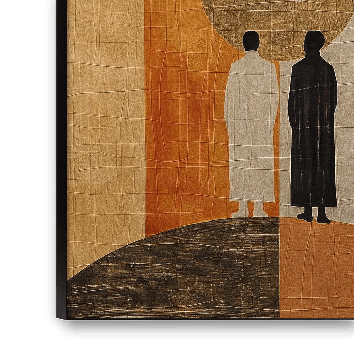 "Dialogue between Ages" is a depiction of a timeless conversation, where figures from different centuries come together against a background of earthy and golden hues. The circles and arcs bridge the worlds, suggesting a continuity beyond the visible. The contrast between the light and dark figures evokes a yin-and-yang harmony and suggests that opposites are necessary for full understanding. This work would be perfect in a modern interior as a symbolic anchor point connecting the room to the richness of the past and the promise of the future.