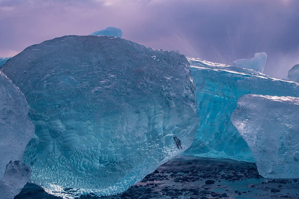A photo of Diamond Beach near Jökulsárlón, Iceland. The pieces of ice have broken off from the Vatnajökull glacier and have been thrown by the wind and tides onto the black beach to melt away very slowly.