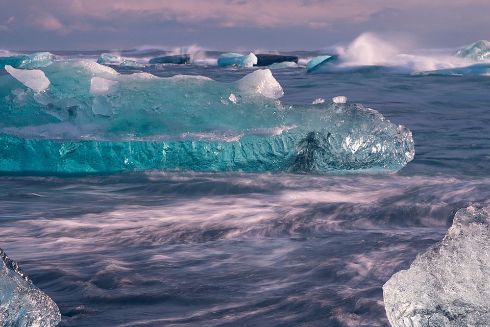 An impression of Diamant Beach near the glacier lake Jökulsárlón. The pieces of ice have broken off from the Vatnajökull glacier and washed ashore via the lake on the black beach of Diamant Beach.