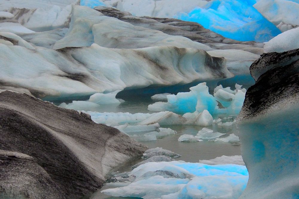 These blue glowing ice floes covered in ash from lava were made in Iceland on Diamond beach.