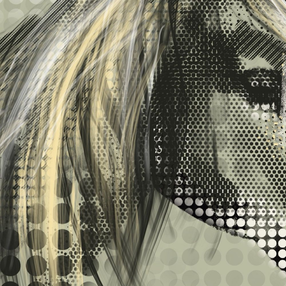 Horse Diana by Go van Kampen. Graphic, modern, in beige-green tones with black and white. I am looking for the balance between abstract and striking work.