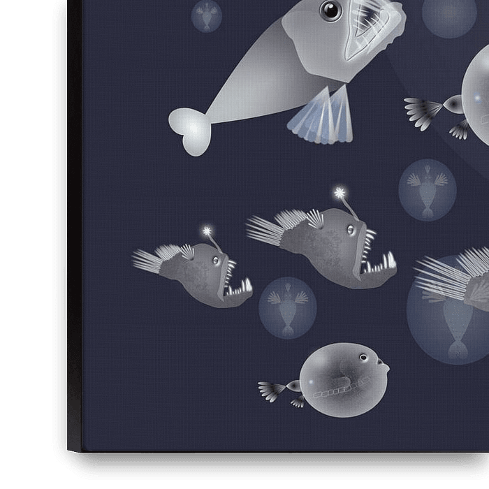 Fantasievolle illustratie van vissen uit de diepzee, sfeer, geheimzinnigheid, avontuur. Vectorillustratie, haarscherp met mooie transparanties en diep van kleur. Voor kinderen en volwassenen.