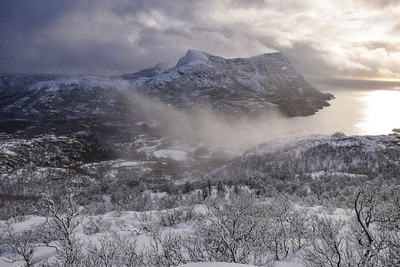 A snow shower clears and the sun breaks through above the fjords near Digermulen, on the Lofoten Islands in northern Norway.
