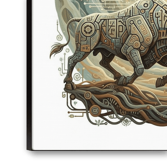Witness a captivating convergence of raw primal power and cutting-edge digital artistry. 'Digital Dominion' presents a majestic bull and a soaring eagle, reimagined as intricate cybernetic entities, their forms etched with circuits and data streams. They emerge from a swirling vortex of ethereal clouds and technological patterns, symbolizing the profound dance between nature's enduring strength and the relentless evolution of the digital world. This artwork invites contemplation on foresight, resilience, and the untamed spirit navigating the vast, interconnected expanse of our modern era. A testament to power, freedom, and the boundless potential of synthesized reality.